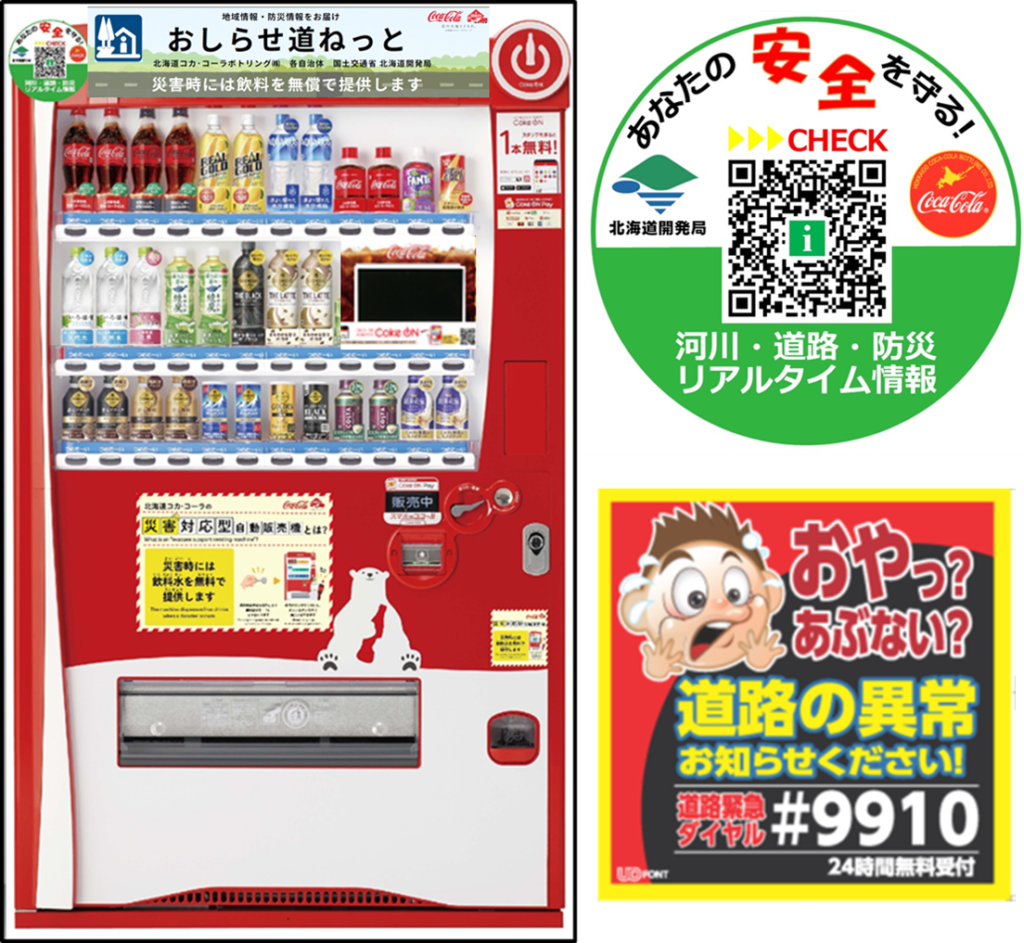 北海道開発局との包括協定に基づき、各自治体とも連携して、道の駅に「おしらせ道ねっと」という情報提供装置付き災害対応型自動販売機を設置しております。「地域・イベント情報」を配信するほか、災害時には二次元コードステッカーから行政が提供するリアルタイム防災情報を取得でき、「フリーベンド」機能により避難者へ自販機内の飲料を無償で提供することができます。また、子育て世代の移動を支援する「子育て応援自動販売機」の展開や道路の異常などを発見した際に通報を促すための啓発ステッカーを、当社のトラックや営業車両への貼付に協力しております。