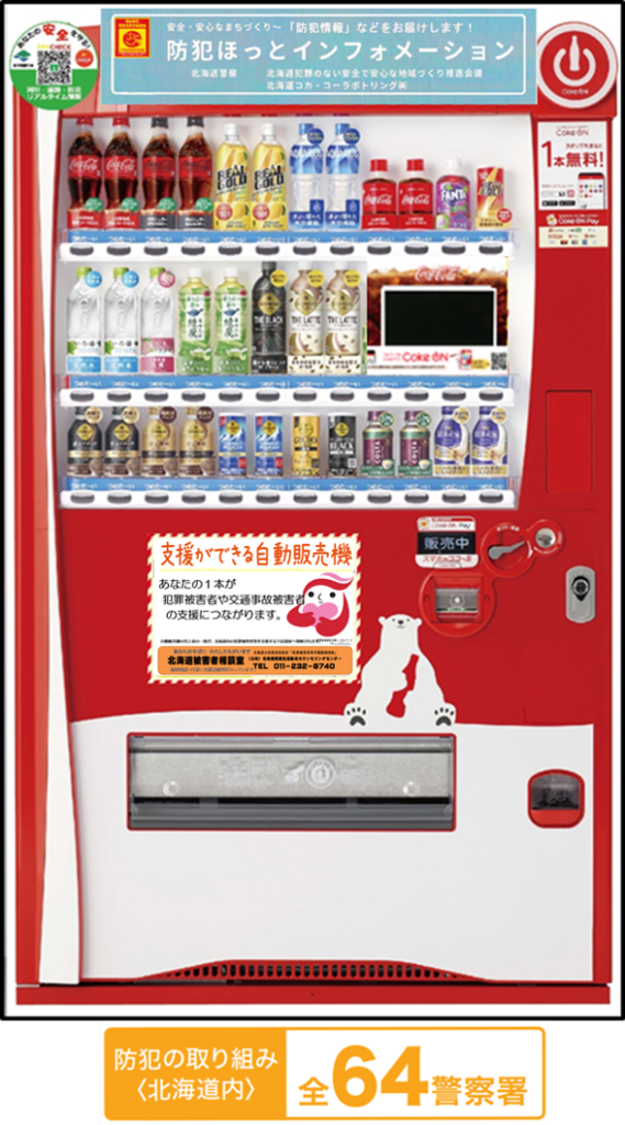全道すべての警察署と協定を結び、自動販売機に設置する液晶モニターで、防犯情報を配信する「防犯ほっとインフォメーション」を運用しています。また、地域の子どもたちが描いた飲酒運転根絶、オレオレ詐欺や児童虐待防止などのポスターを自動販売機のポスター掲示部分を活用して掲出しています。自動販売機は、防犯の分野での社会インフラとしても機能しています。